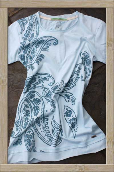 Women’s Paisley Tee Shirt $52Roll over image to magnifyThis wrap-around graphic makes a bold statement on our fit-to-flatter basic tee. Deep tonal paisley encircles the entire shirt. Available in Aqua in S, M, and L. More Info/Order |